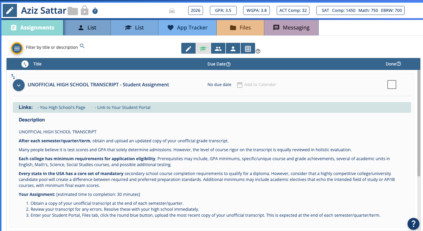 utilizing assignments can turn the complex journey of college readiness into a streamlined and manageable process for both the student and the counselor. In scenarios where one counselor manages multiple students, optimizing the counselor's time becomes essential. Standardizing any part of the workflow inevitably enhances clarity and efficiency. The most time-consuming aspect of this process is often the "readiness" phase, where communication and task management are most intensive. By structuring assignments strategically, as vehicles that carry information back and forth and containers that hold all associated assets - the counselor creates a uniquely organized file system for each student. Counselors can better manage this critical phase, ensuring that both their time and their students' efforts are used most effectively.