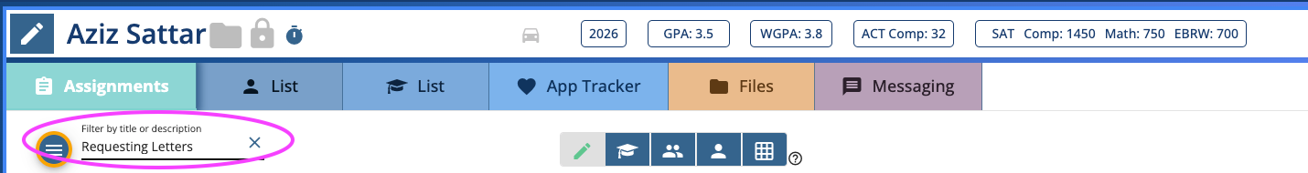 The counselor navigates to the student's Assignment's tab and uses the search filter to search by key word for the assignment regarding gathering letters of recommendation.