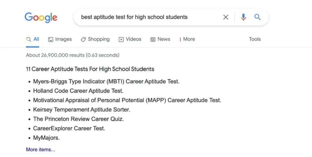 It may seem strange not to define what an aptitude test is first. However, by knowing what an aptitude test isn’t, you’ll better understand the value they provide your students. You see, the internet is rife with scammy aptitude tests. And you don’t want to be caught pushing an inferior service to your students. For example, if you google the “Best Aptitude Test for High School Students,” you’ll likely see the following results.