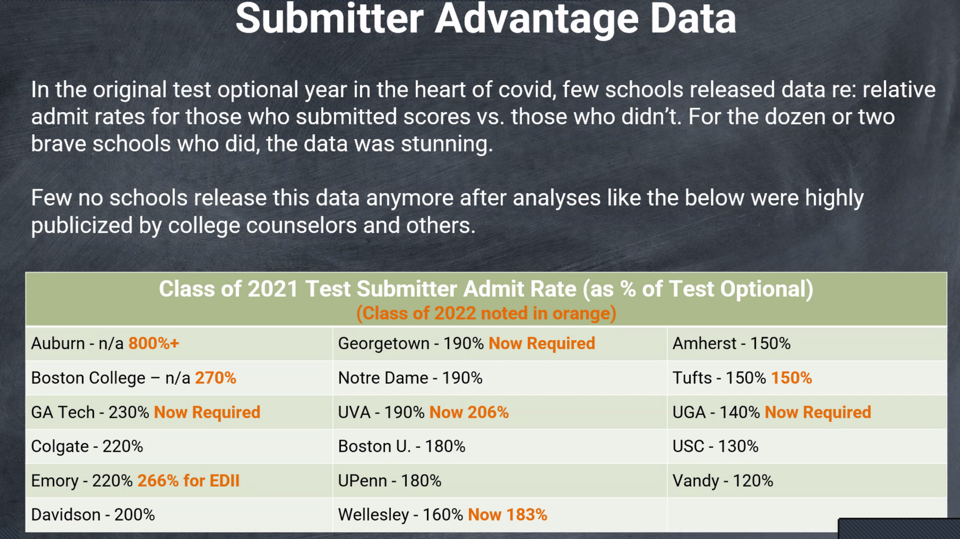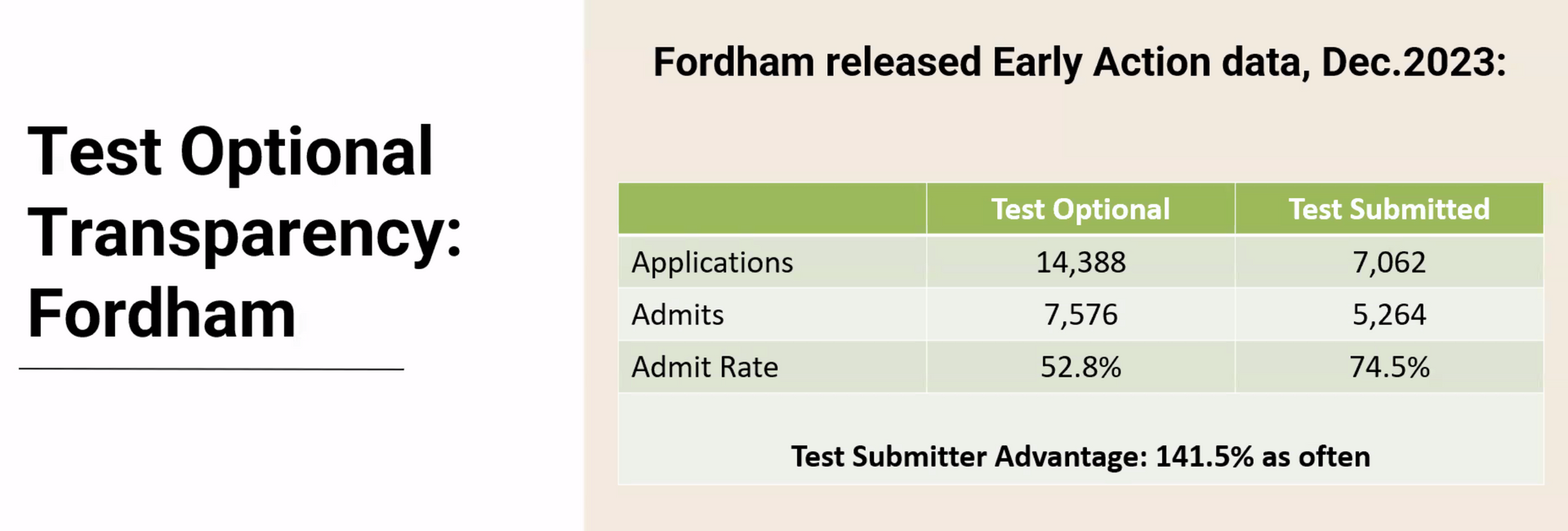 Data from several universities, including Fordham, shows that students who submit test scores are admitted at a much higher rate.